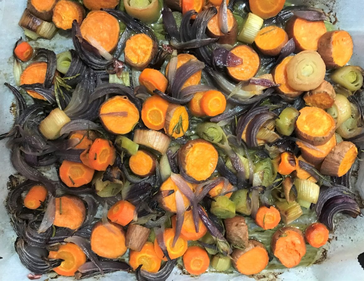 -חותכים את כל הירקות לקוביות גדולות (את הבטטה אין צורך לקלף) ומסדרים אותם בתבנית מרופדת בנייר אפייה.