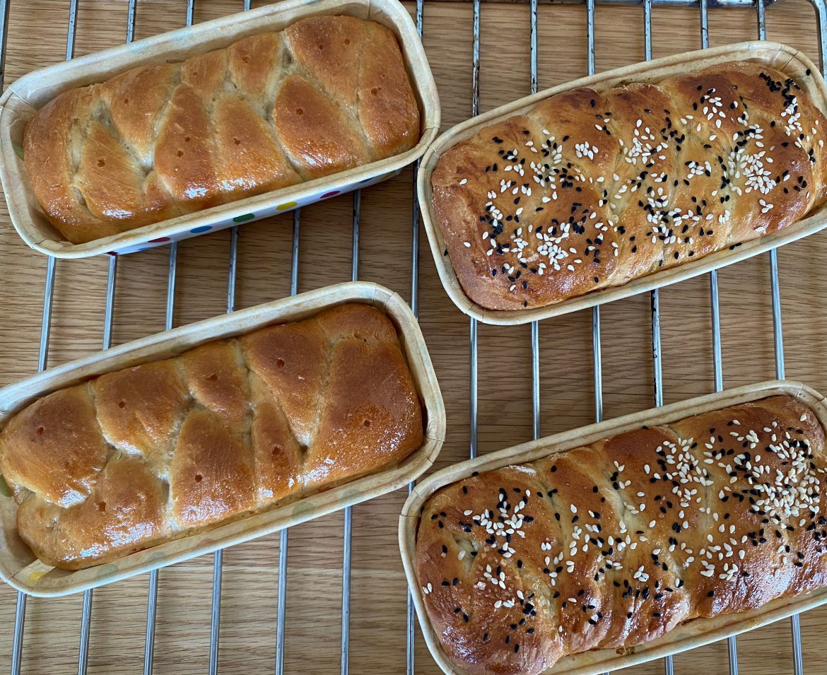 -לוקחים כל חלק ומחלקים לשלוש רצועות, קולים צמה ומניחים בתבנית מרופדת בנייר אפייה (או בתבנית אינגלישקייק קטנה) . כך עושים עם שאר הבצק.