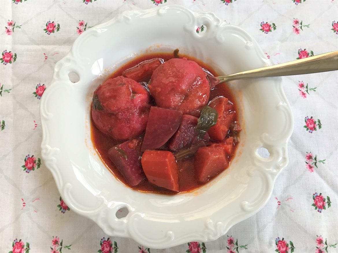 -כשהמרק רותח נכניס בזהירות את הקובות לתוך המרק, נטעם את המרק ונתקן טעמים אם צריך (אולי גם צריך להוסיף מים, המראה צריך להיות כמו מרק, די נוזלי). נביא שוב לרתיחה. ננמיך אש ונמשיך לבשל על אש נמוכה כשעה.