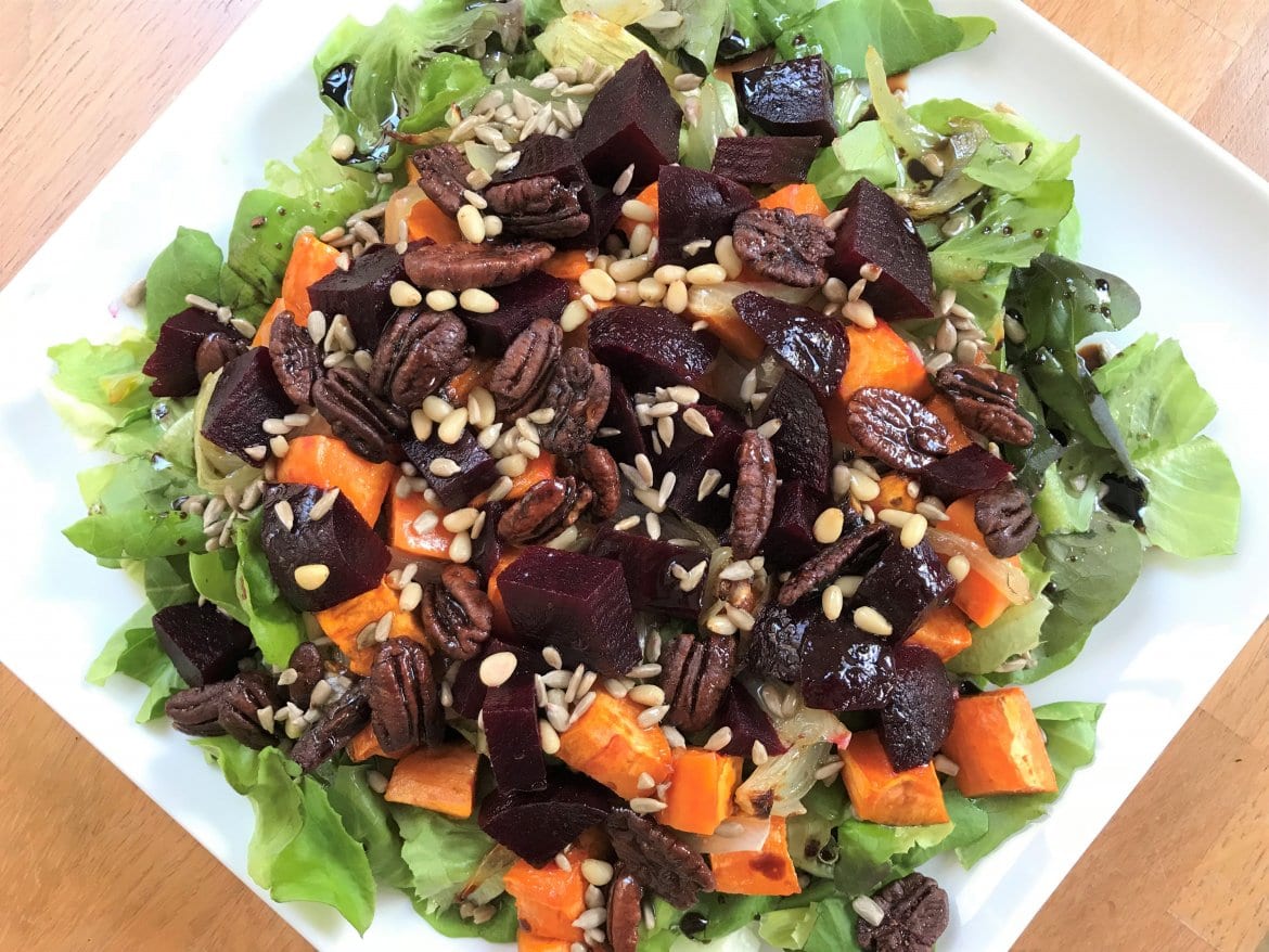 -מרכיבים את הסלט: על צלחת הגשה מניחים את עלי החסה מעליהם את הבטטות והבצל האפויים, הסלק ומפזרים את כל הפיצוחים.