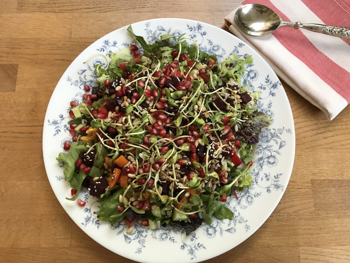 -מוסיפים מעל הירקות את החמוציות, גרעיני החמנייה, הדלעת, השומשום והרימון