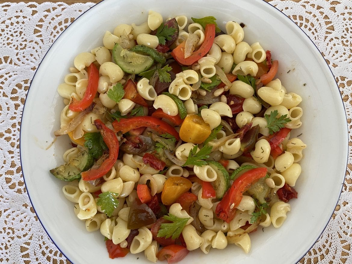-מרכיבים את הסלט: בקערה מניחים את הפסטה והירקות המבושלים מוסיפים את העגבניות המיובשות והטריות, הצנוברים והפטרוזיליה, מזלפים את הרוטב על הסלט מערבבים וטורפים.