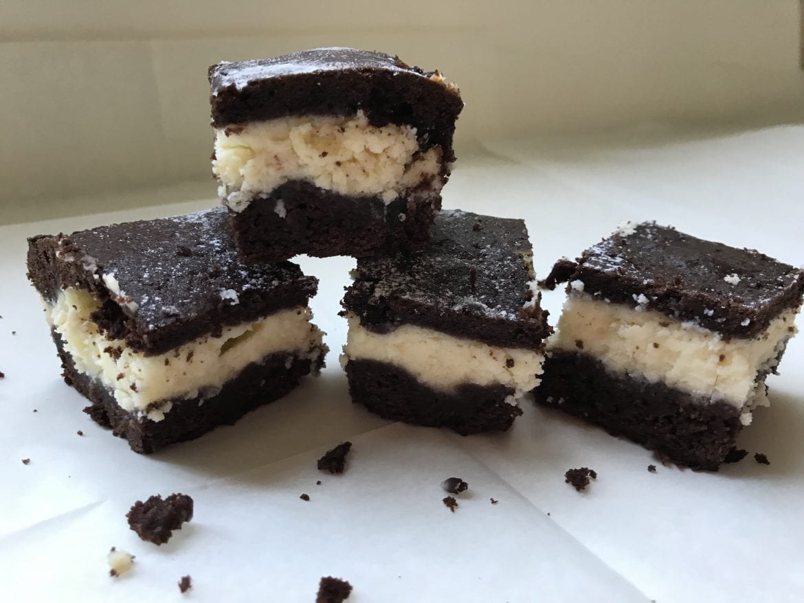 שתי שכבות של עוגת שוקולד, אחת למעלה אחת למטה, עוטפות שכבת גבינה.