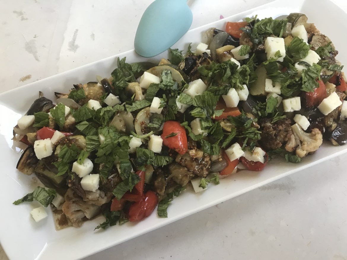 -מסגרים את הירקות בכלי נגשה, מזלפים מעל את הרוטב, מפזרים את קוביות הגבינה שבחרתם ואת הנענע והבזיליקום.