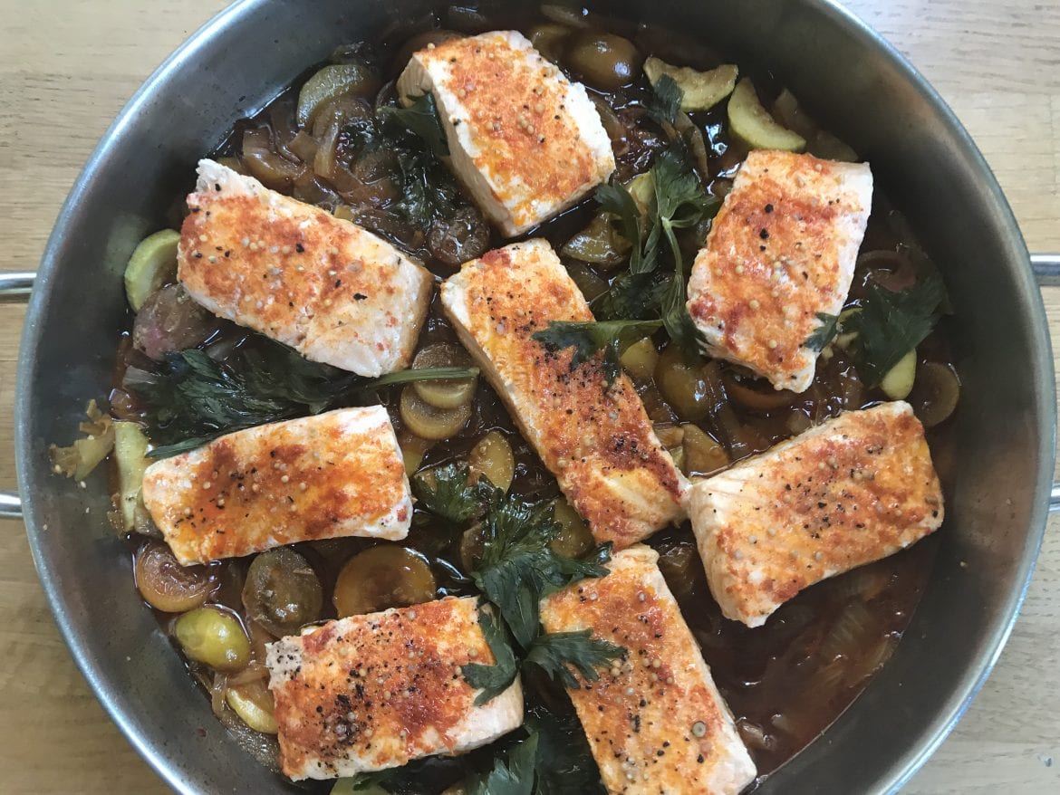 -מסדרים את חתיכות הדג בסיר בין הירקות, מערבבים את כל חומרי הרוטב ושופכים לסיר.